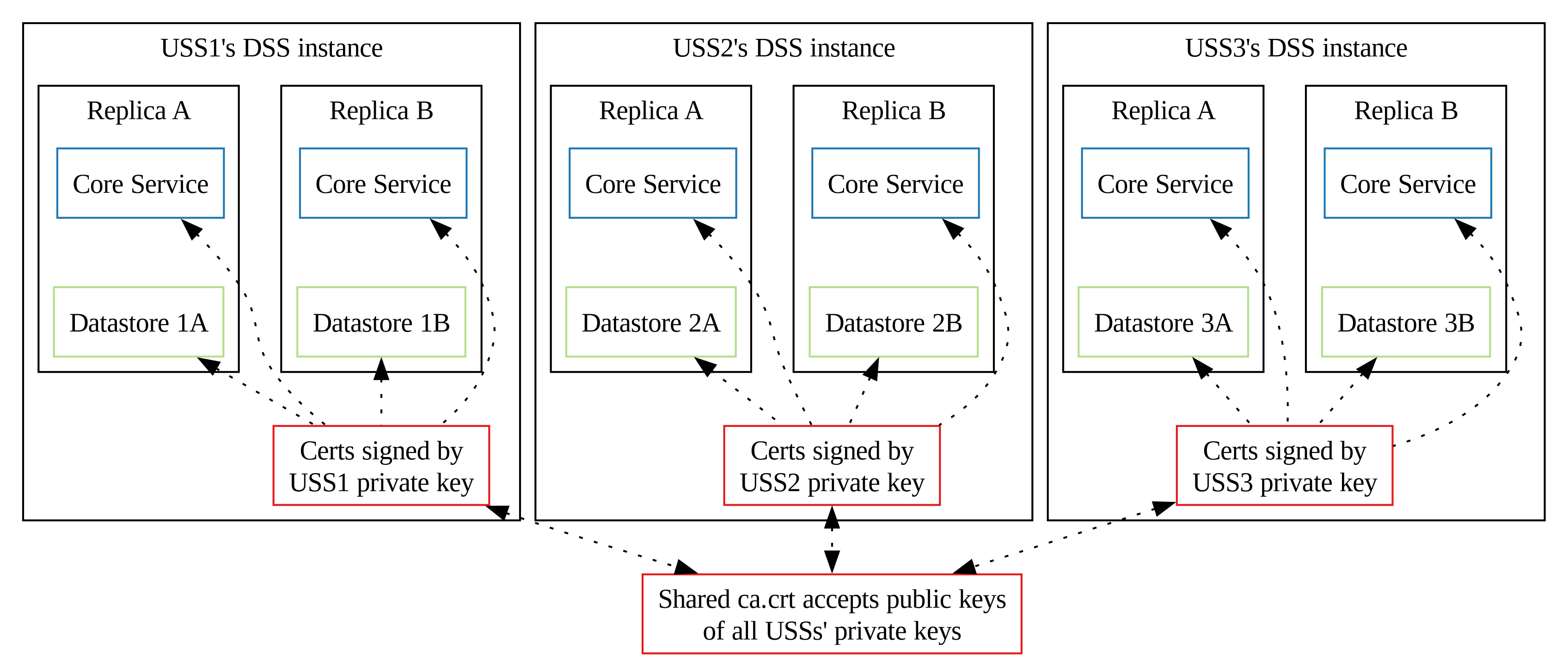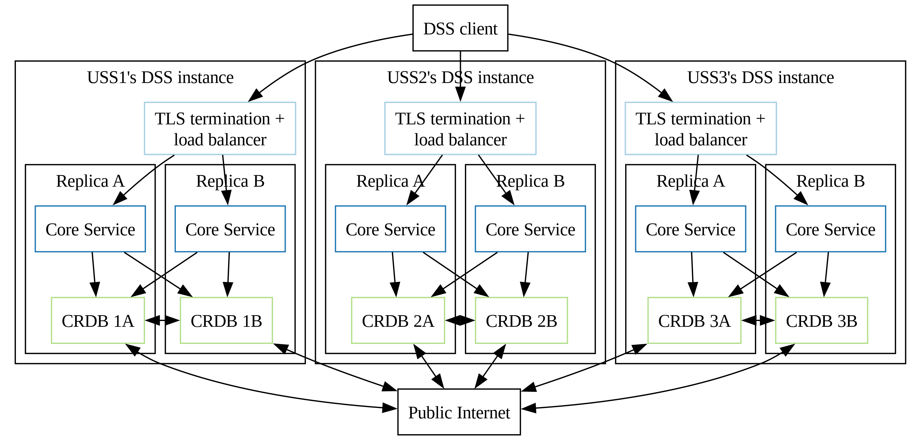 The expected deployment configuration of a DSS pool supporting a DSS Region is multiple organizations to each host one DSS instance that is interoperable with each other organization's DSS instance. A DSS pool with three participating organizations (USSs) will have an architecture similar to the diagram below.