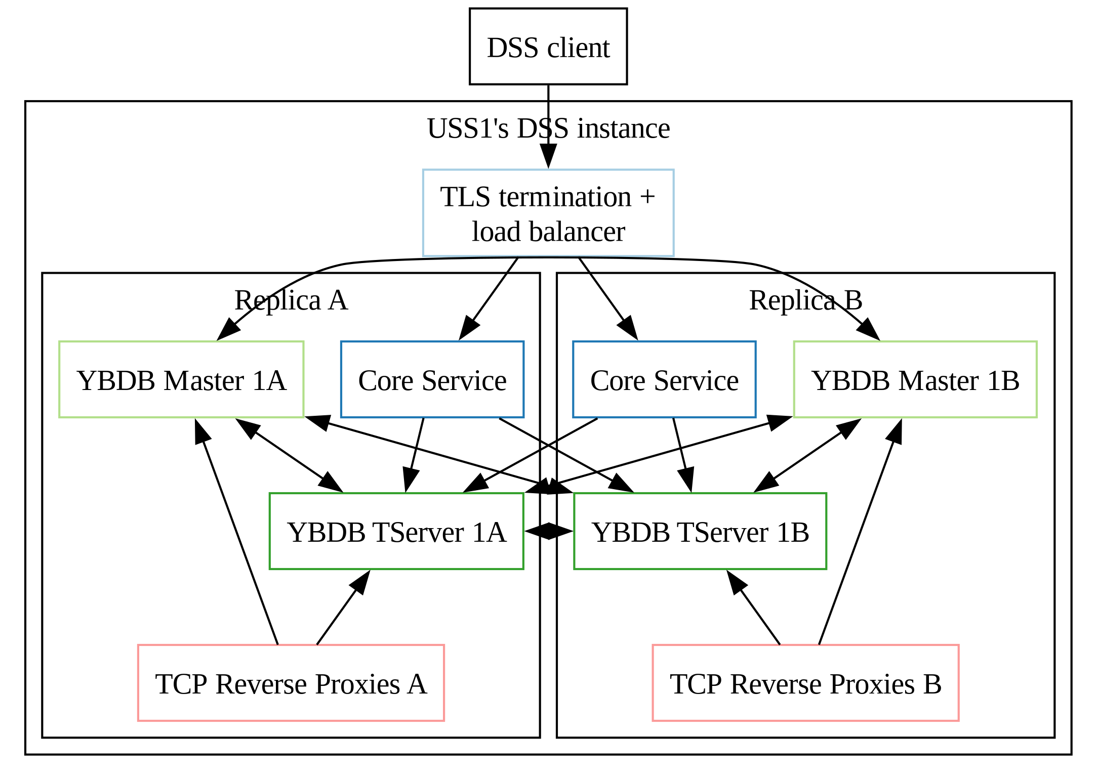 Note that the diagrams below shows 2 stateful sets per DSS instance. Currently, the helm and tanka deployments produce 3 stateful sets per DSS instance. However, after Issue #481 is resolved, this is expected to be reduced to 2 stateful sets.