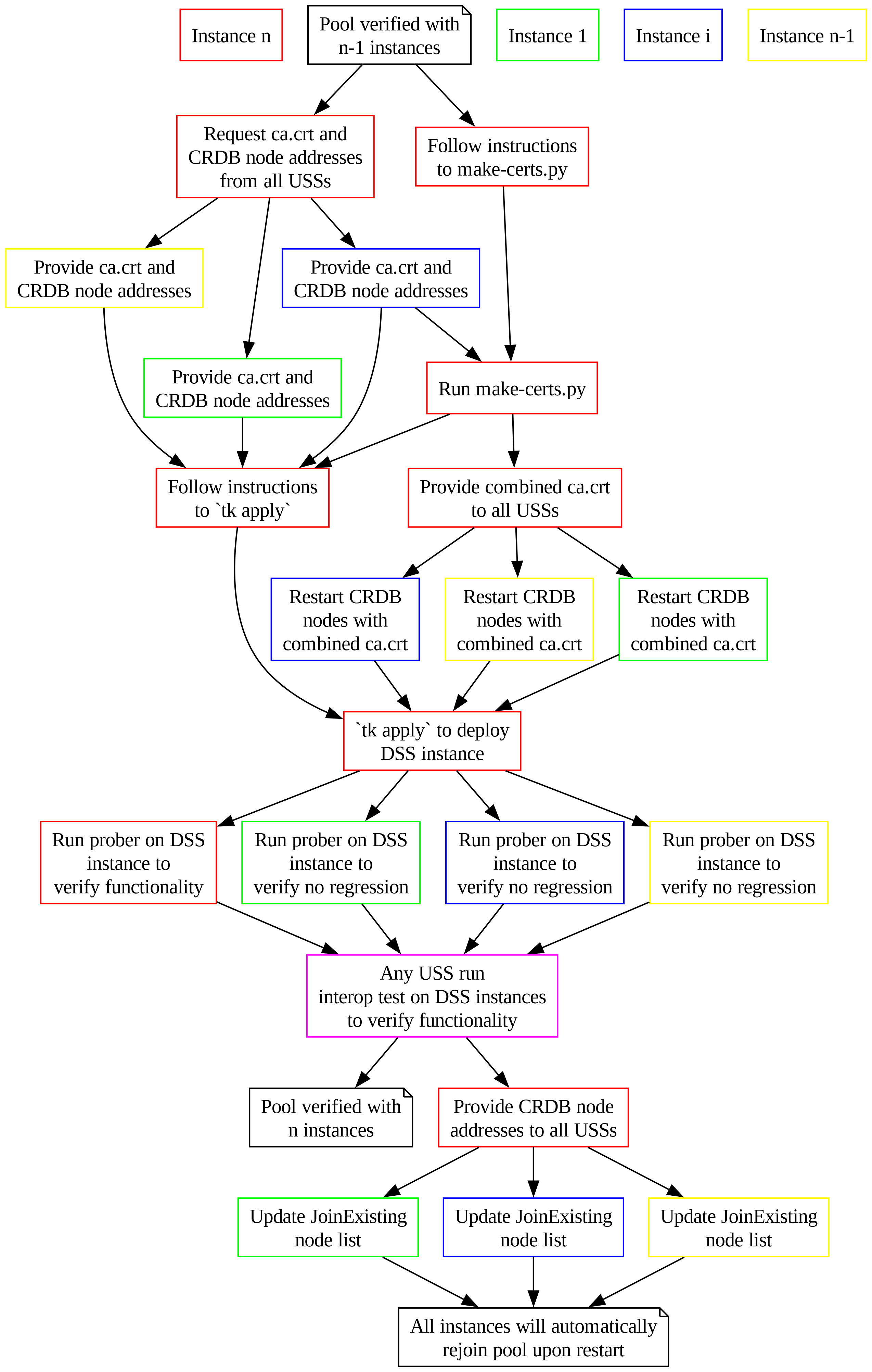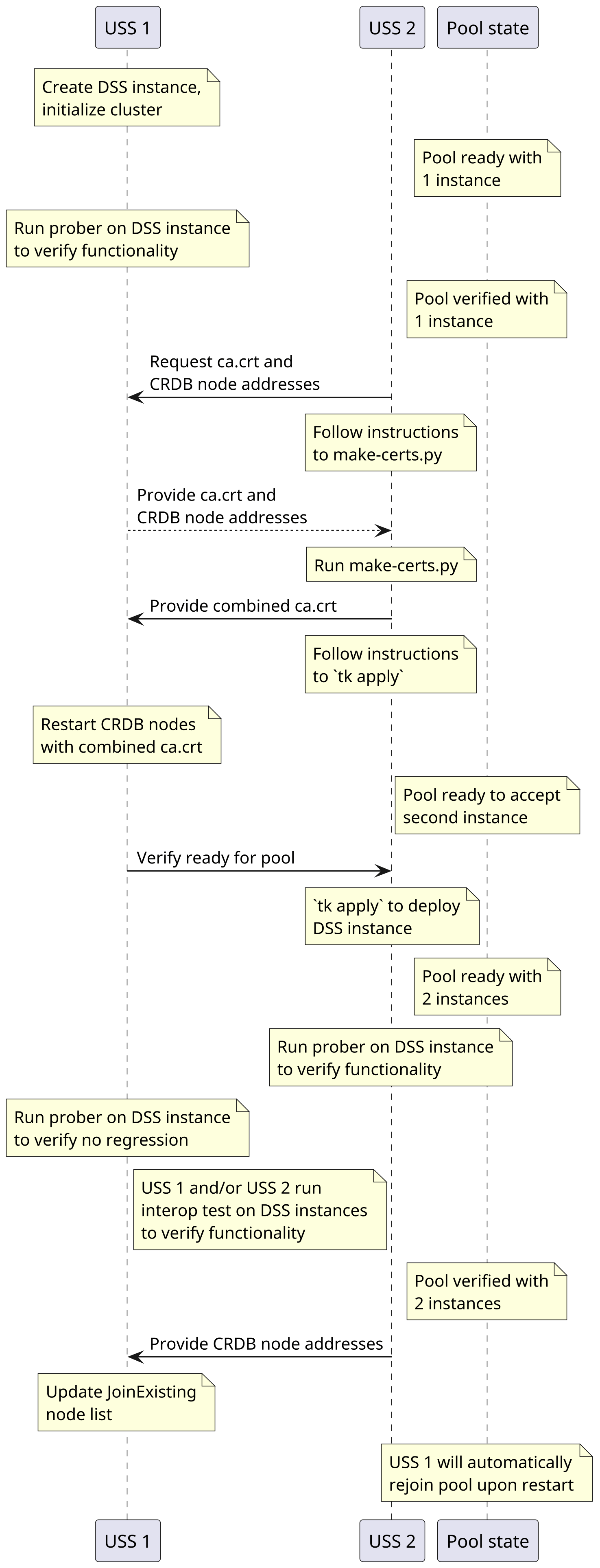 A USS wishing to join an existing pool (of perhaps just one instance following the prior section) should follow the deployment instructions. They will be joining an existing cluster, and they will need to request the ca.crt that the pool is currently using (any one member of the pool may provide it). The joining USS will also need a list of node addresses to which they should connect; ideally this will include at least 2 nodes from each existing DSS instance.