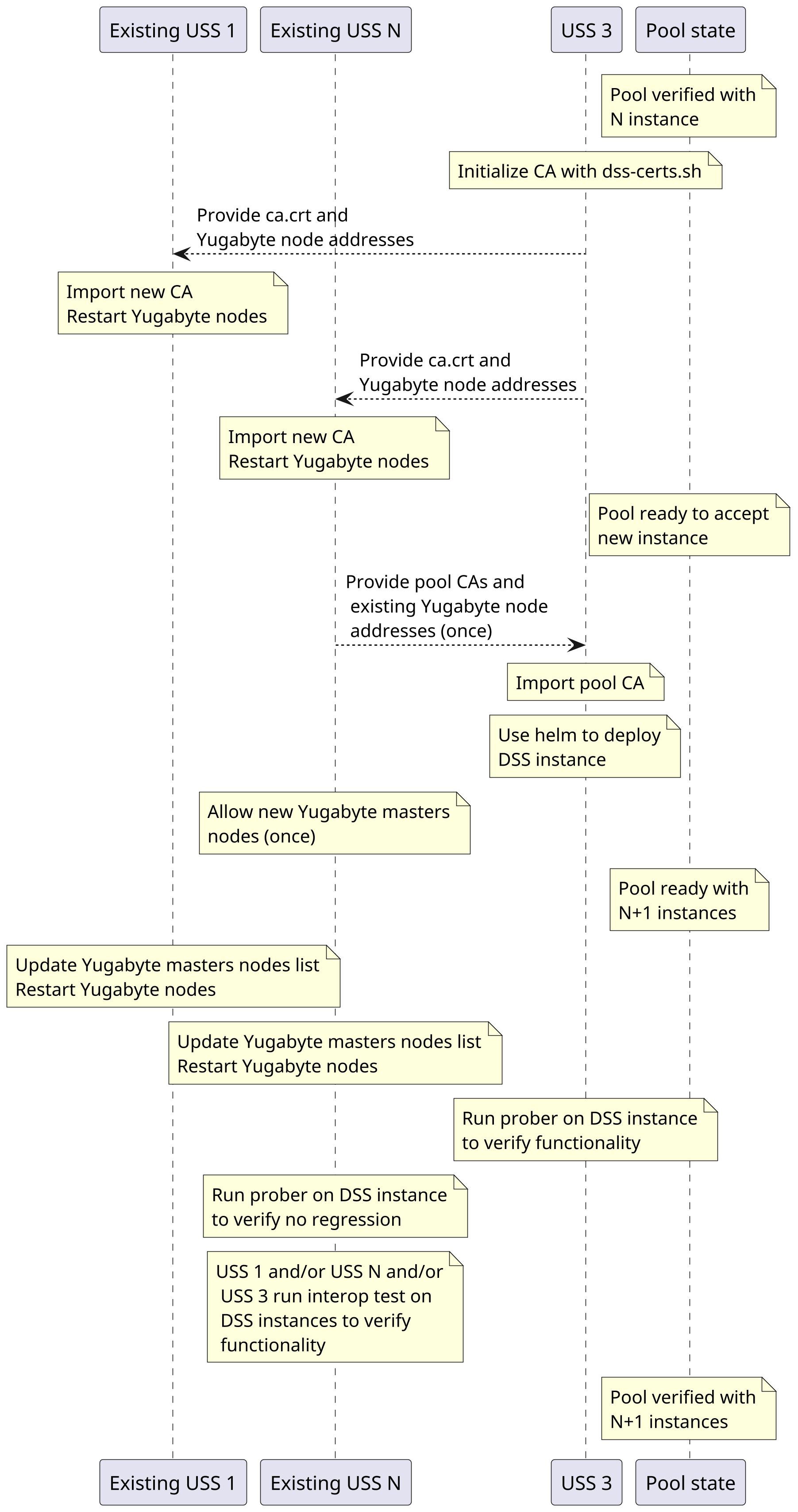A USS wishing to join an existing pool (of perhaps just one instance following the prior section) should follow the deployment instructions. They will be joining an existing cluster, and they will need to request all CAs that the pool is currently using (any one member of the pool may provide it). The joining USS will also need a list of Yugabyte node addresses.
